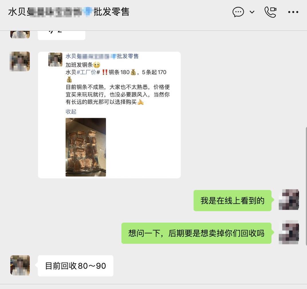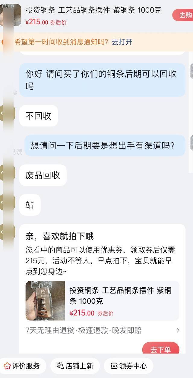 最直接的问题是缺乏回收渠道。与成熟的黄金、白银投资市场不同,目前多数售卖投资铜条的商家明确表示“只卖不收”。即使有商家表示可以代卖,但个人投资者买入铜条后仍很可能陷入“难变现”的困境。